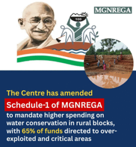 Centre amended Schedule-I of MGNREGA (Sep 23, 2025) → mandates minimum spending on water conservation & harvesting works at block level.